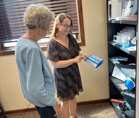 At the North Dakota Assistive Demonstration Center in Fargo, an assistive technology (AT) consultant, Shannon Bozovsky, demonstrated a range of tools designed to help with daily living. These included the RAZ Memory Cell Phone, smartphone accessibility features, bed and bathroom organization tools, bookshelf door decals, elopement tracking devices, contrasting dishes to support eating, and locked medication dispensers. After the visit, M’s daughter-in-law shared her appreciation in a follow-up message: “Thank you so much for heightening our awareness to so many resources out there to manage day-to-day life. Appreciate all you do!”